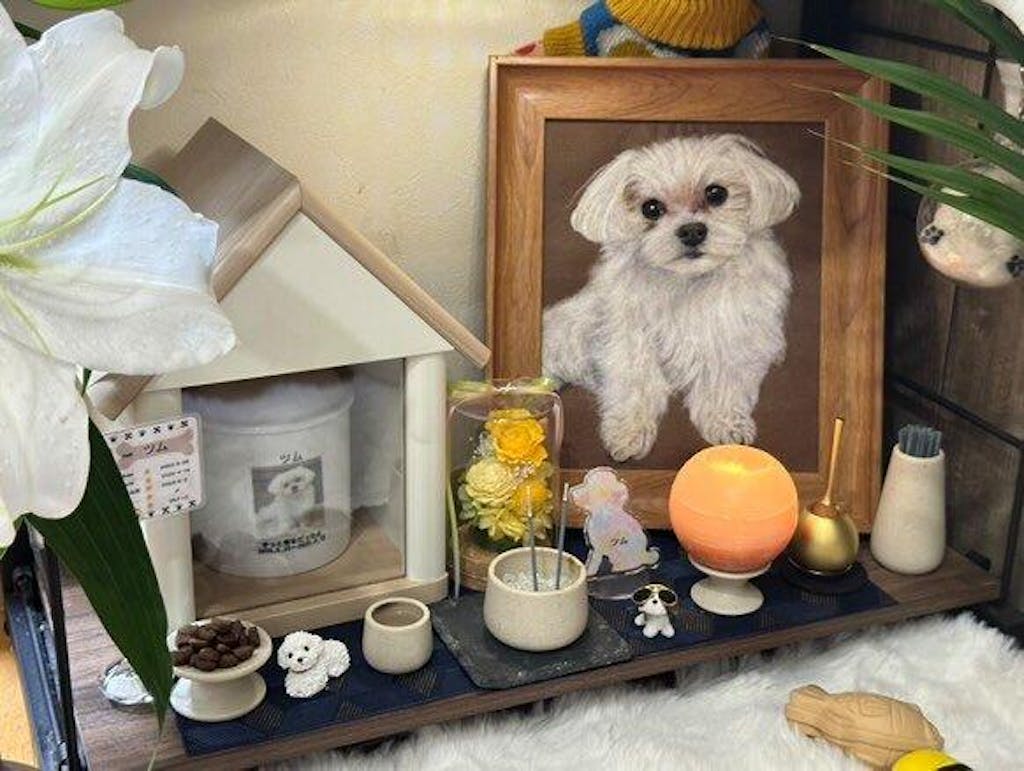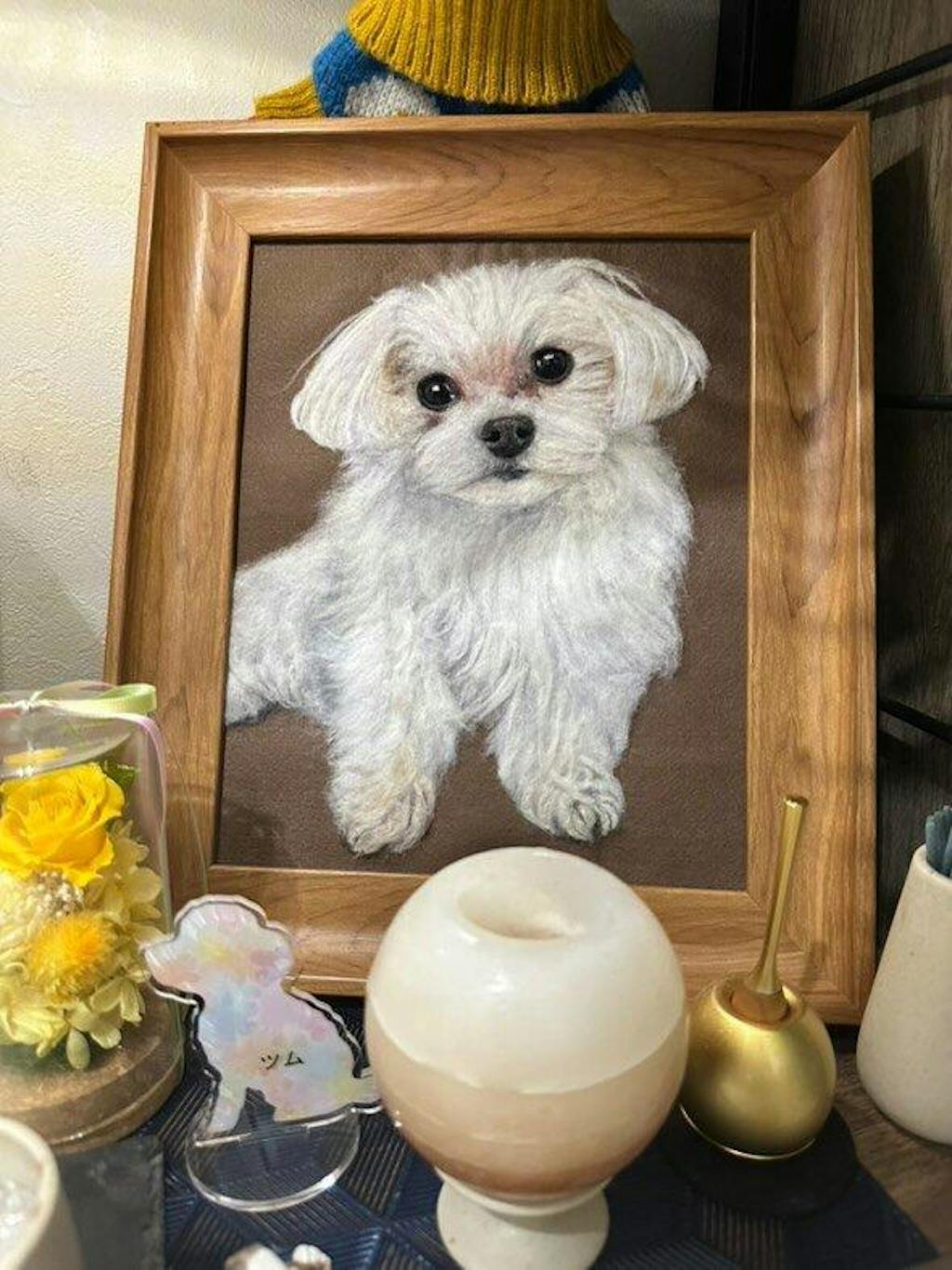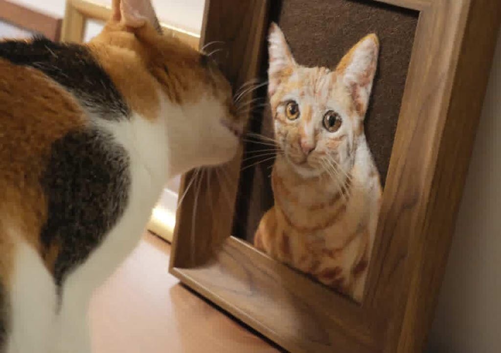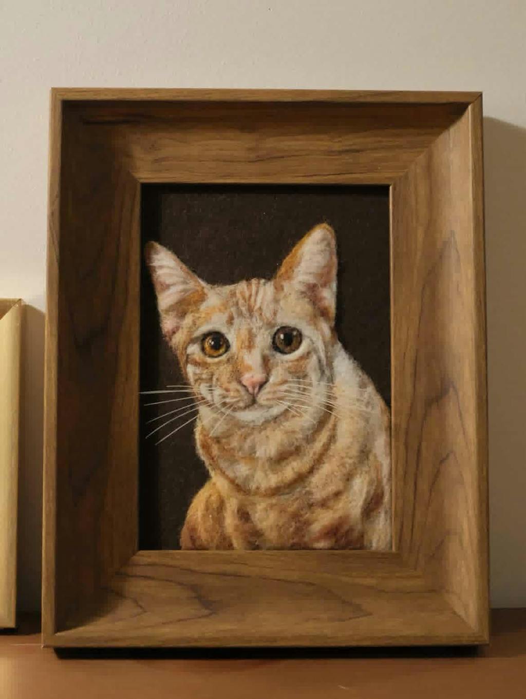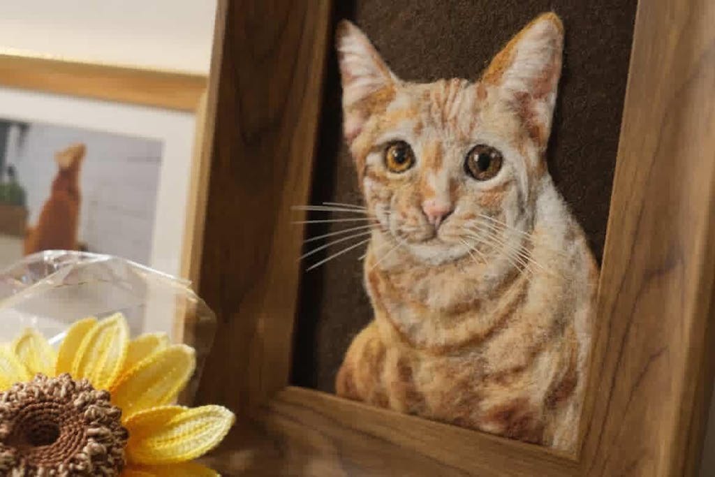 My beloved cat has been gone for many years. I happened to see the wool felt portraits made by the shop owner and was deeply attracted. I then commissioned a portrait of my departed cat. His little companion seemed to see him return and couldn't help but be affectionate.